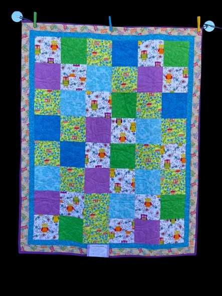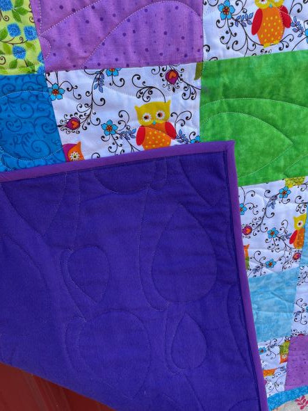 Very cute with playful designs of owls and cute little houses. Lots of bright color blocks of fabric in this quilt. From blues to purples and oranges to greens. Back fabric is of dark purple flannel. 100% Cotton of Domestic and Imported fabric front and back.